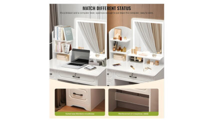 3. Огромен простор за складирање: маса за шминкање со фиоки Лесно организирајте ја вашата нега на кожата, шминката и секојдневните неопходни работи користејќи ги повеќекратните прегради и фиоки дизајнирани за практично складирање на предмети.