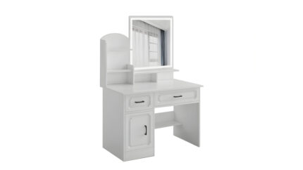 2. Мултифункционален дизајн: Нашите шминкери се совршени за мали простори. Кога огледалото е отворено, тоа е елегантна маса за маса за шминкање; кога е затворен, беспрекорно се трансформира во ноќна маса, работна маса или кабинет за складирање. нудејќи разновидност и функционалност.