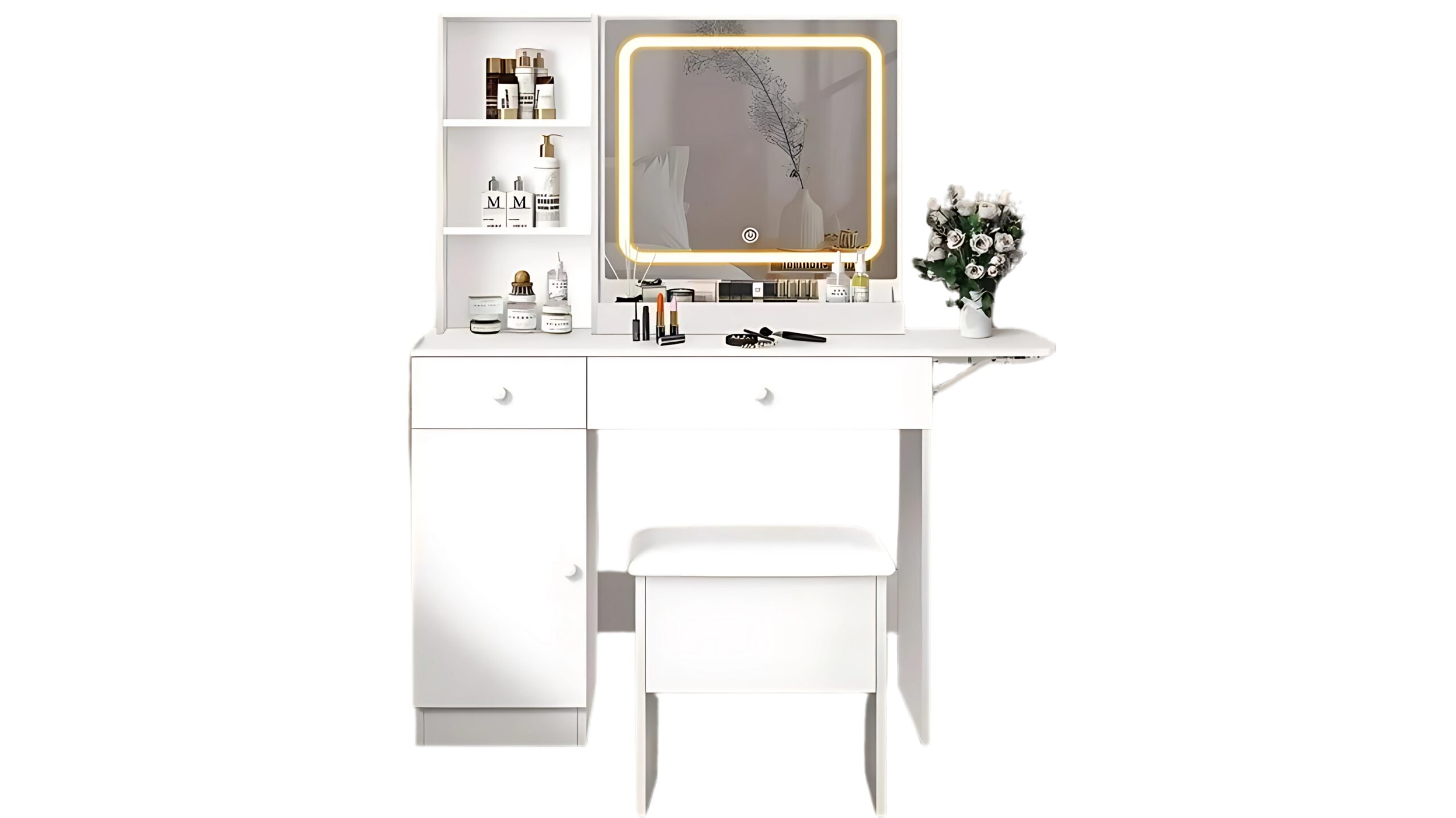 Доволно складирање и удобност – Нашата работна маса нуди доволно простор за складирање со 2 фиоки, 1 кабинет, 3 отворени полици и прегради и приспособлива полица поставена на десната страна за проширување на работната површина. Организирајте ги вашите најважни работи за убавина без напор.