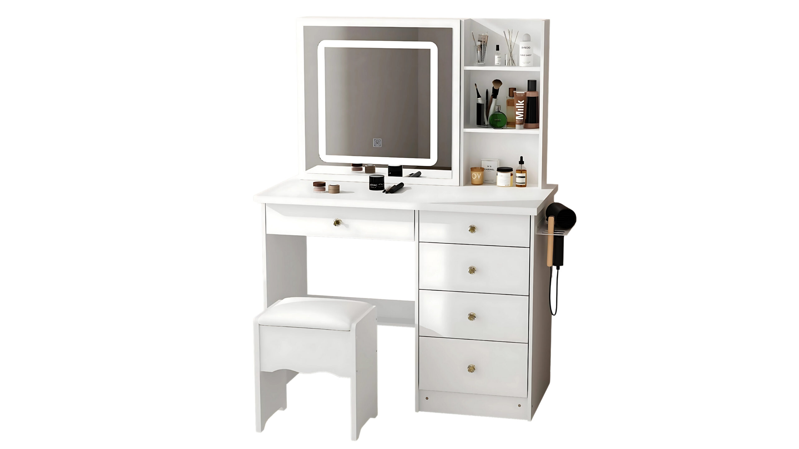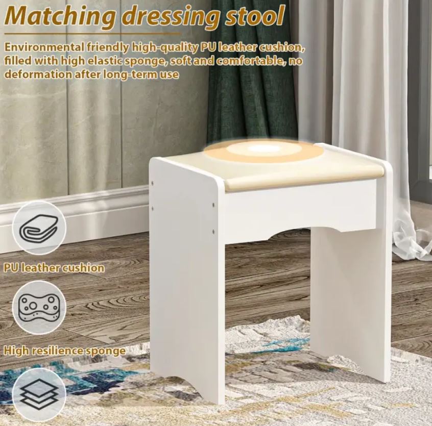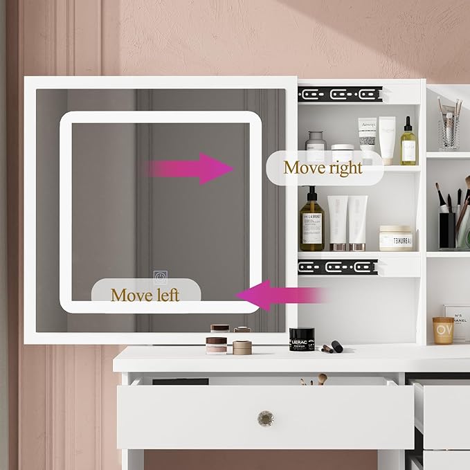 Има толку многу простор за складирање, вклучувајќи полици на 3 нивоа скриени зад огледалото, совршени за организирање на сите ваши козметички производи и производи за убавина. Со 4 странични фиоки и 1 поголема фиока, со работна површина од 39,3 инчи, можете да управувате со вашата козметика, тушеви за очи, лак за нокти, палети на сенки за очи и така натаму.