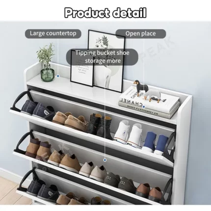Полица за чевли со 3 врати. Елегантната и едноставна рустична боја ја прави уредна и убава и добро се вклопува во многу различни стилови на домот. Идеална за влез, ходник, дневна соба или трем за да го одржувате вашиот дом уреден и да заштедите простор. Преклопна полица за чевли: Модерната самостојна полица за чевли има преклопна фиока што заштедува простор и е лесна за отворање и затворање. Во споредба со обичните полици за чевли, оваа тесна полица за чевли може да се постави во тесни простори.